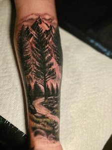 This image shows a close-up of a back tattoo with intricate crest elements, including fine shading and detailed texture…